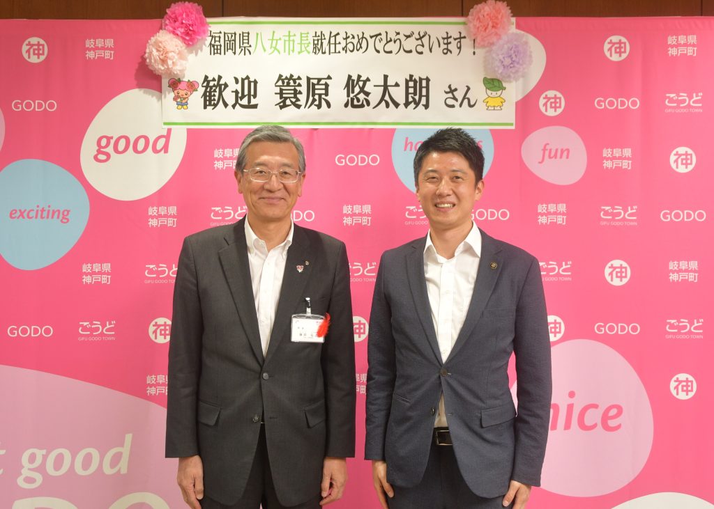 簑原市長は、平成27年度に経済産業省入省後、国家公務員Ⅰ種の初任者研修である「地方自治体実地体験」の際に、神戸町役場で研修を受けられました。私は当時総務部長ということで研修受け入れのお世話をさせていただき、研修終了後も、役場にお越しいただくなど、親しくさせていただいておりました。
