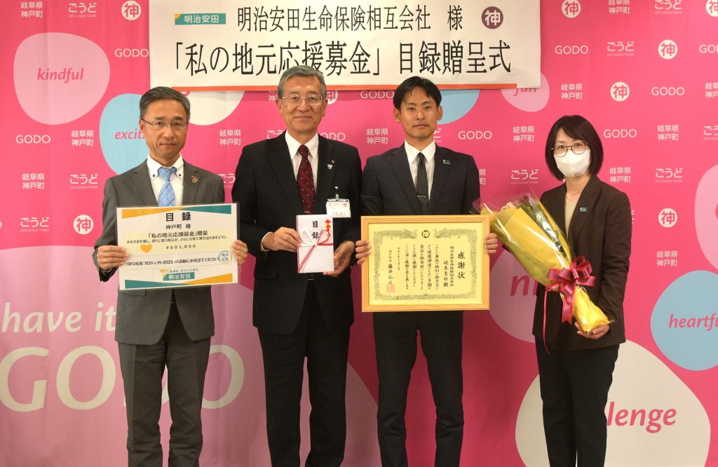 本日明治安田生命保険相互会社様より、「地元の元気プロジェクト」の取り組みの一環として、60万1,800円のご寄附をいただきました。